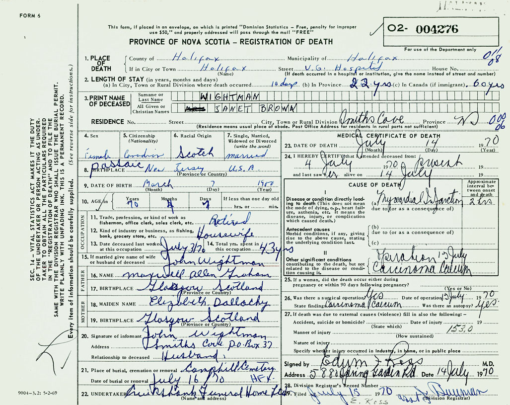PROVINCE OF NOVA SCOTIA — REGISTRATION OF DEATH