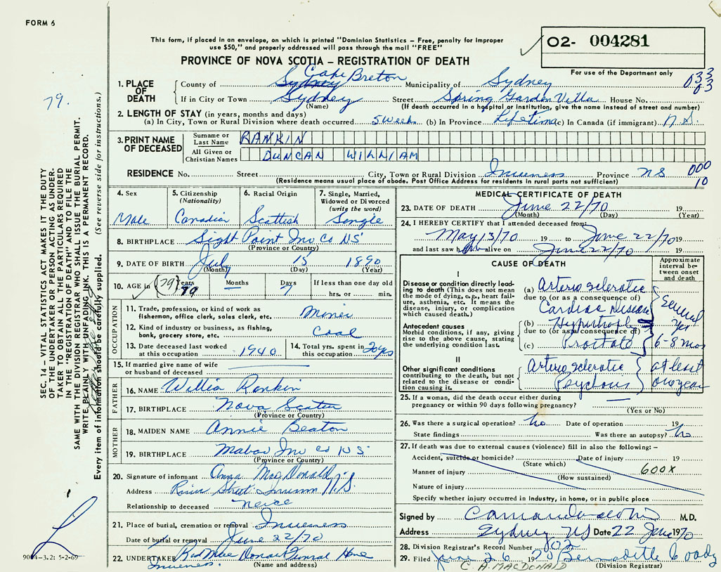 1. PLACE OF DEATH County of Cape Breton If in City or Town Sydney