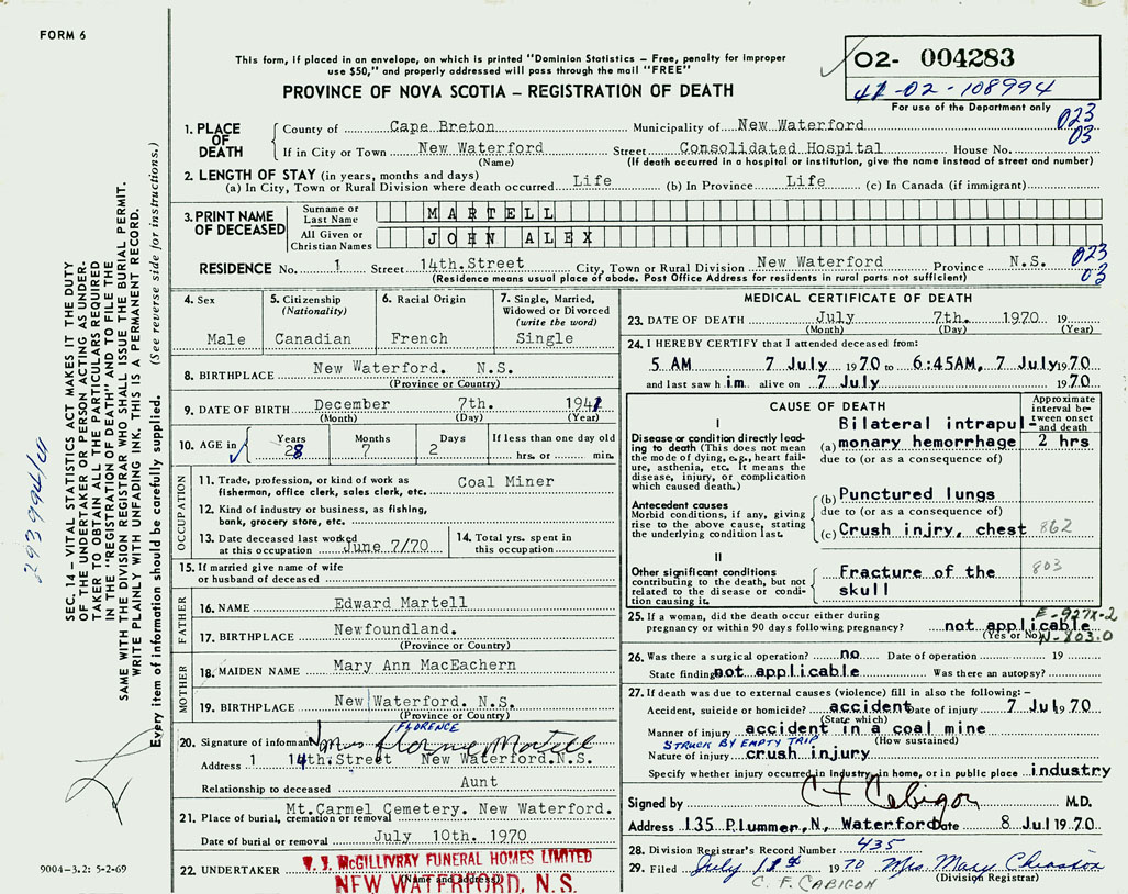 1. PLACE OF DEATH County of Cape Breton If in City or Town New Waterford