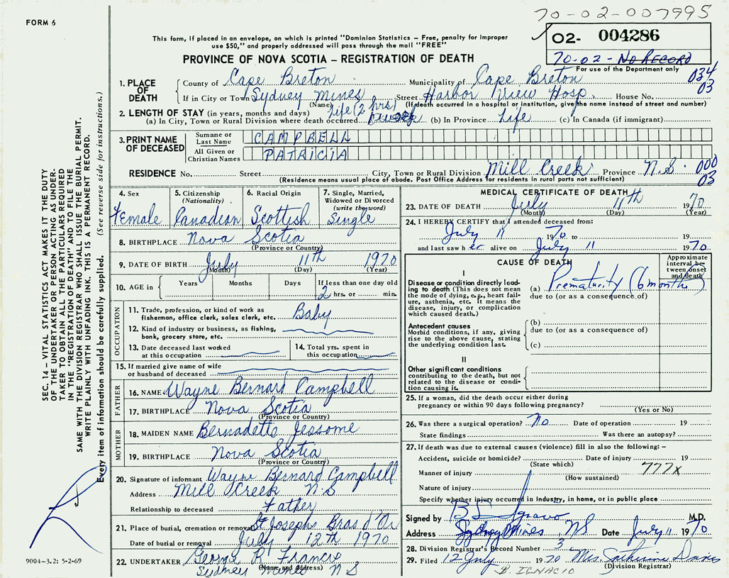 1. PLACE OF DEATH County of Cape Breton If in City or Town Sydney Mines