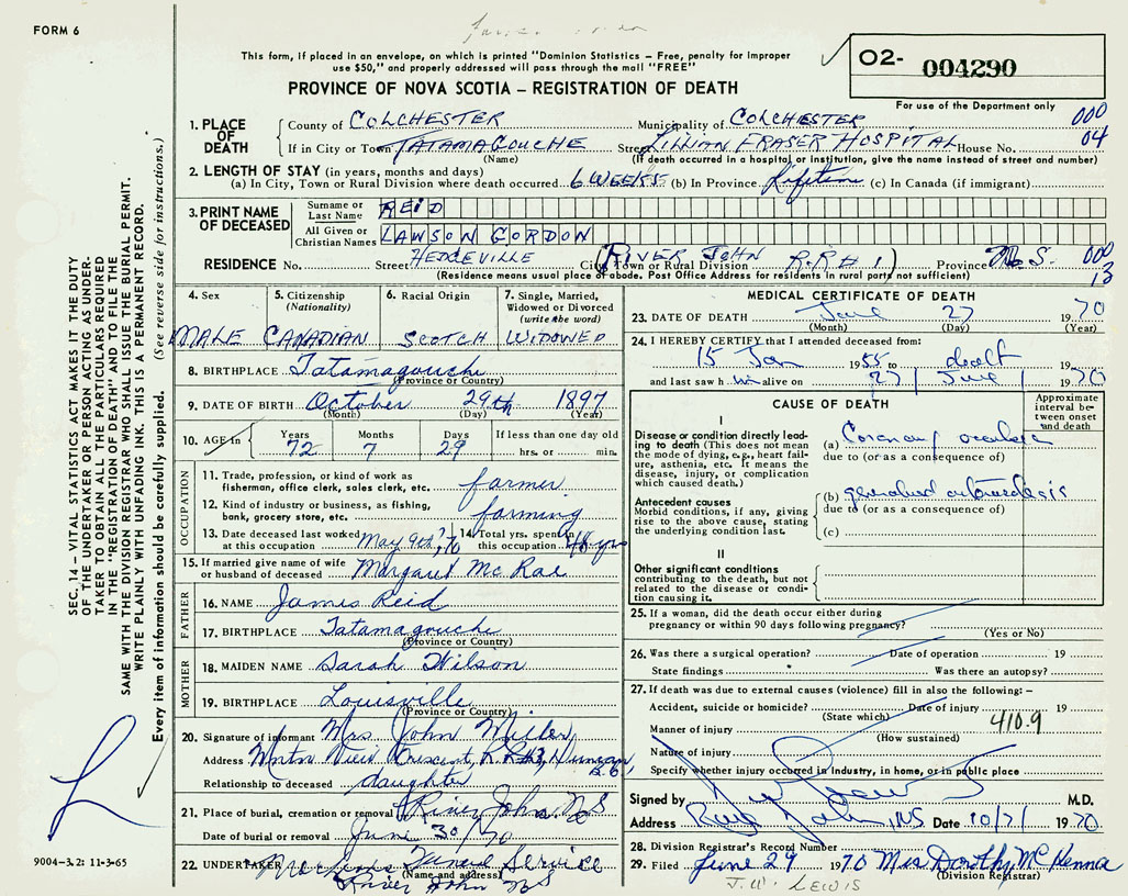 PROVINCE OF NOVA SCOTIA — REGISTRATION OF DEATH