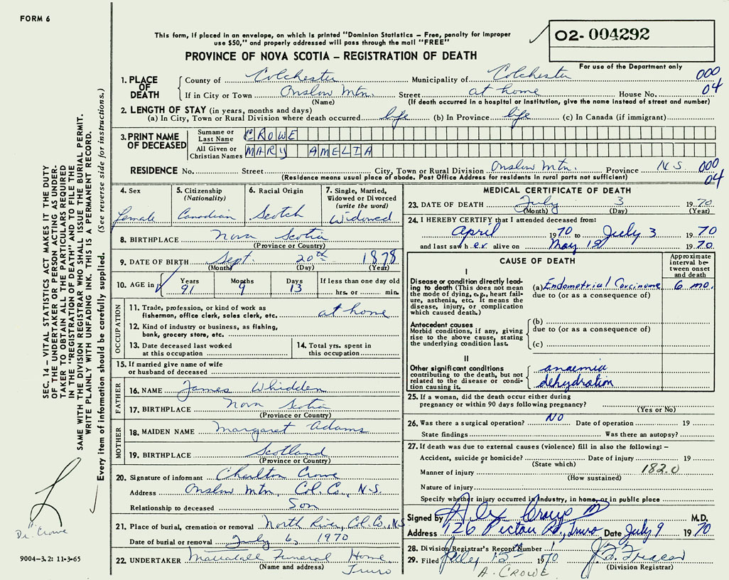PROVINCE OF NOVA SCOTIA — REGISTRATION OF DEATH