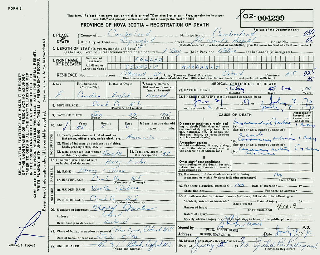 PROVINCE OF NOVA SCOTIA — REGISTRATION OF DEATH