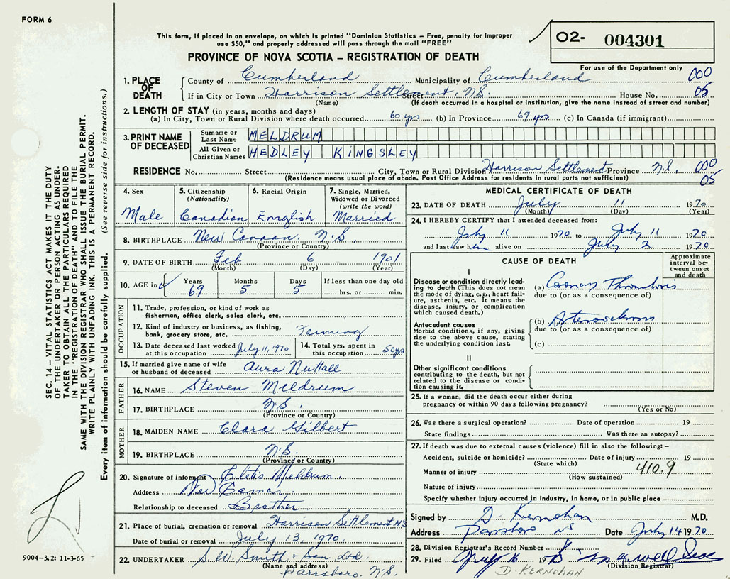 PROVINCE OF NOVA SCOTIA — REGISTRATION OF DEATH
