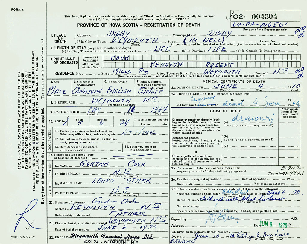 PROVINCE OF NOVA SCOTIA — REGISTRATION OF DEATH