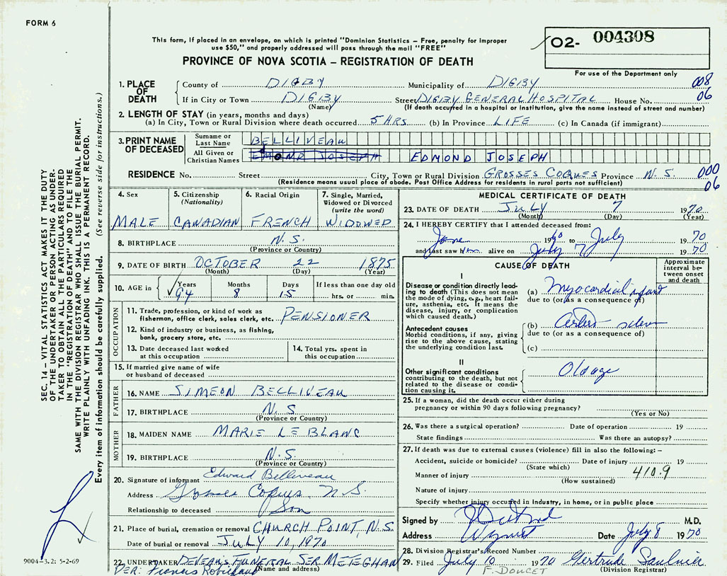 3. PRINT NAME OF DECEASED Belliveau, Edmond Joseph