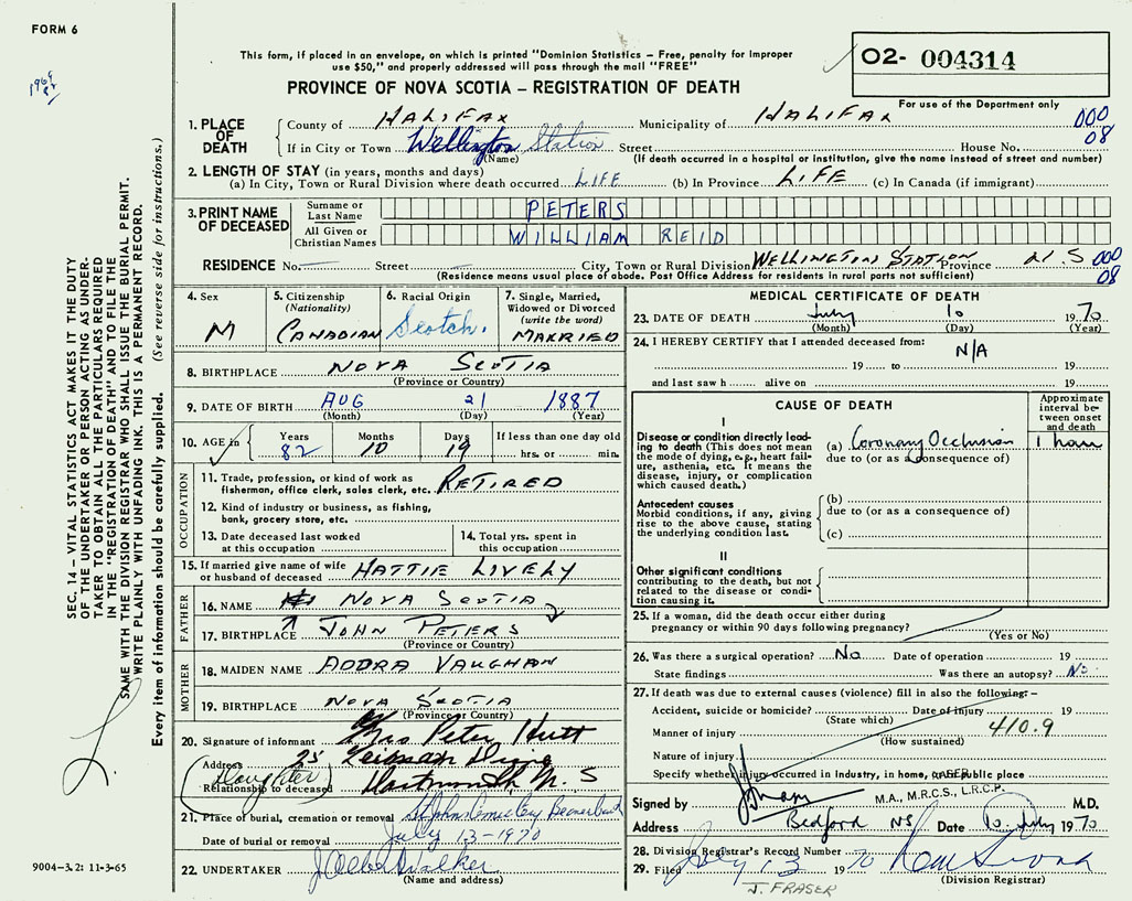 PROVINCE OF NOVA SCOTIA — REGISTRATION OF DEATH