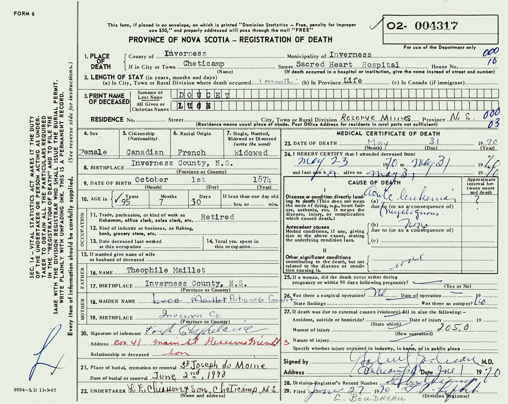1. PLACE OF DEATH County of Inverness If in City or Town Cheticamp