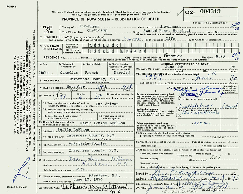1. PLACE OF DEATH County of Inverness If in City or Town Cheticamp