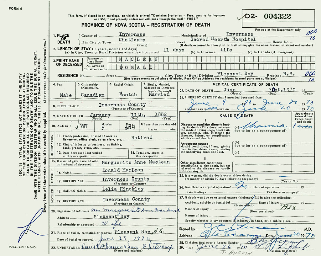 1. PLACE OF DEATH County of Inverness If in City or Town Cheticamp