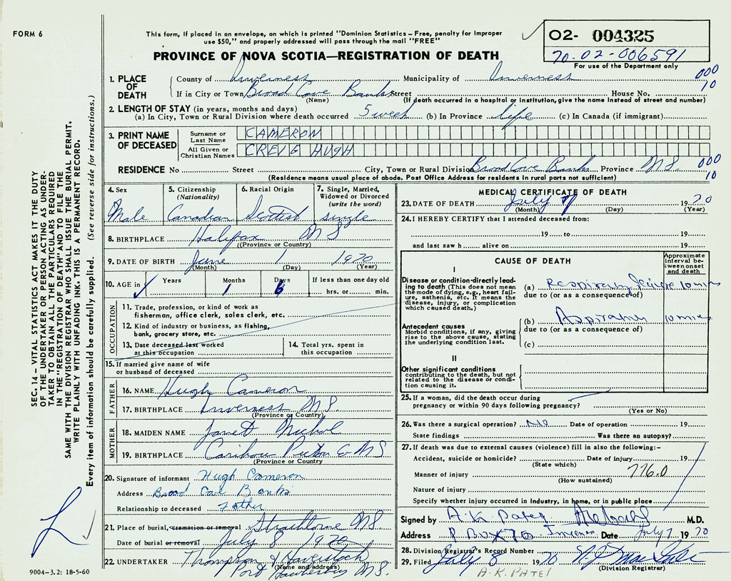 1. PLACE OF DEATH County of Inverness If in City or Town Broad Cove Banks