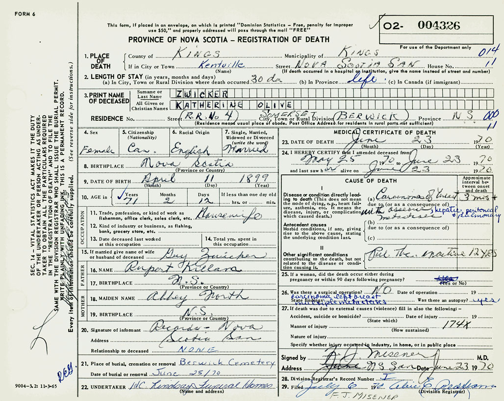 1. PLACE OF DEATH County of Kings If in City or Town Kentville