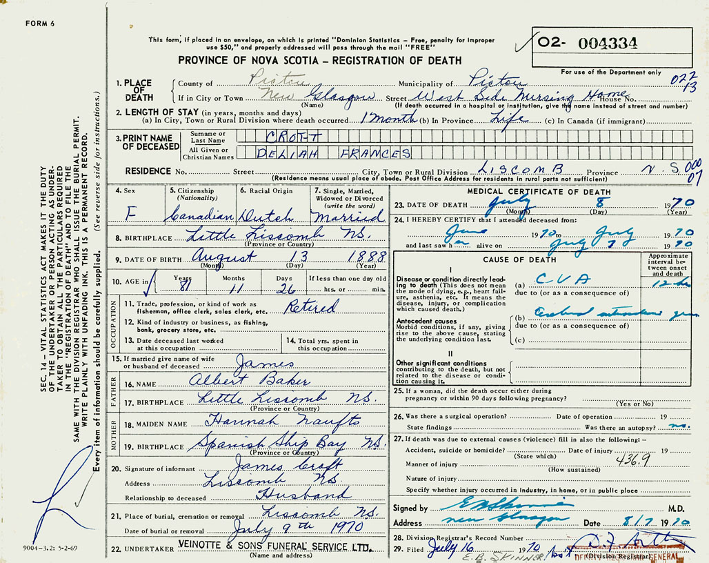 PROVINCE OF NOVA SCOTIA — REGISTRATION OF DEATH