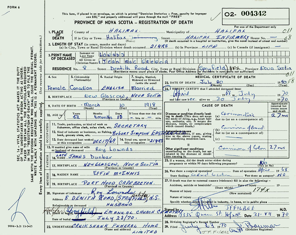 PROVINCE OF NOVA SCOTIA — REGISTRATION OF DEATH