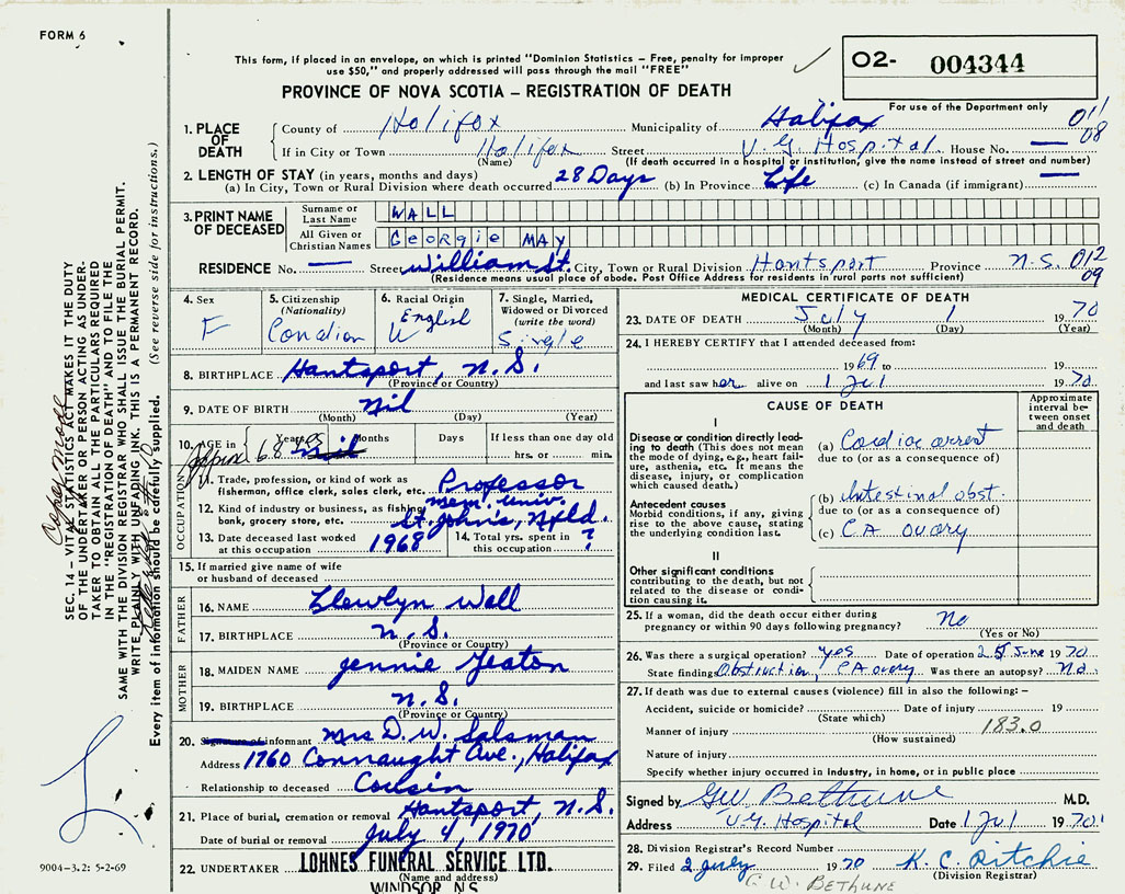 PROVINCE OF NOVA SCOTIA — REGISTRATION OF DEATH
