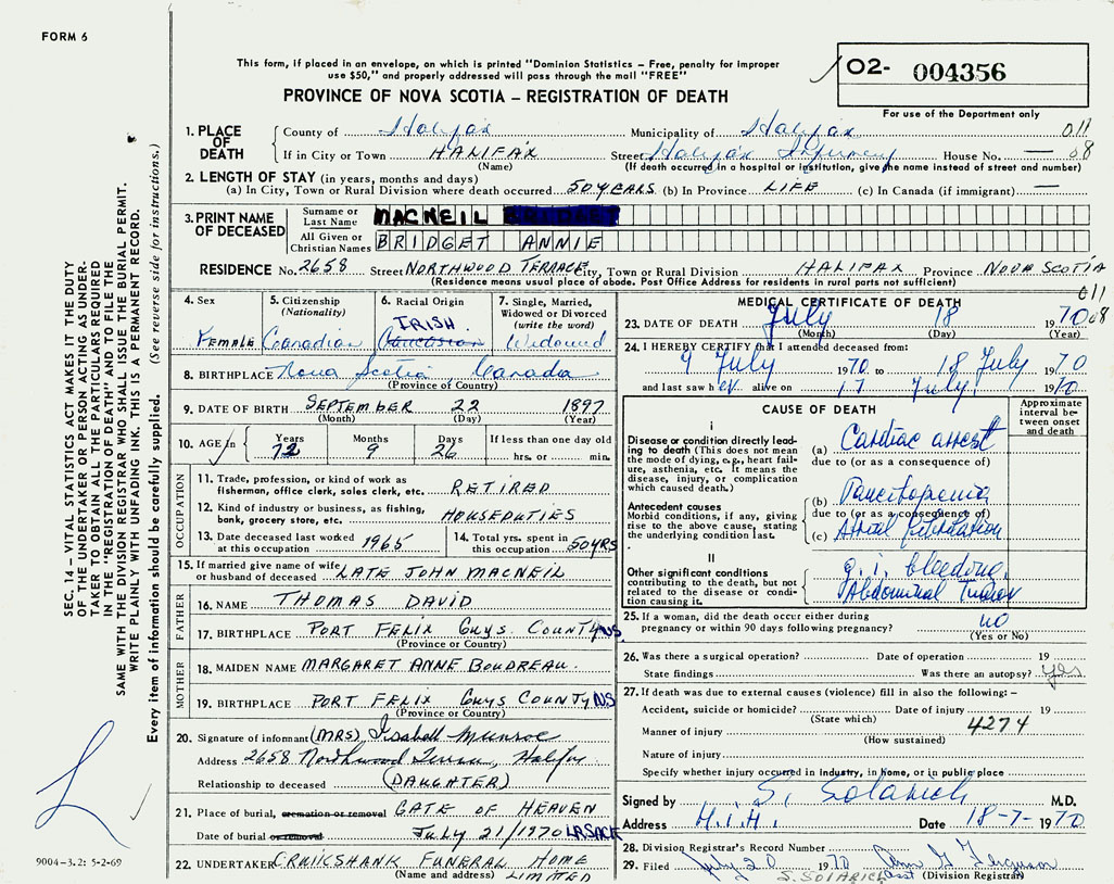 3. PRINT NAME OF DECEASED MacNeil, Bridget Annie