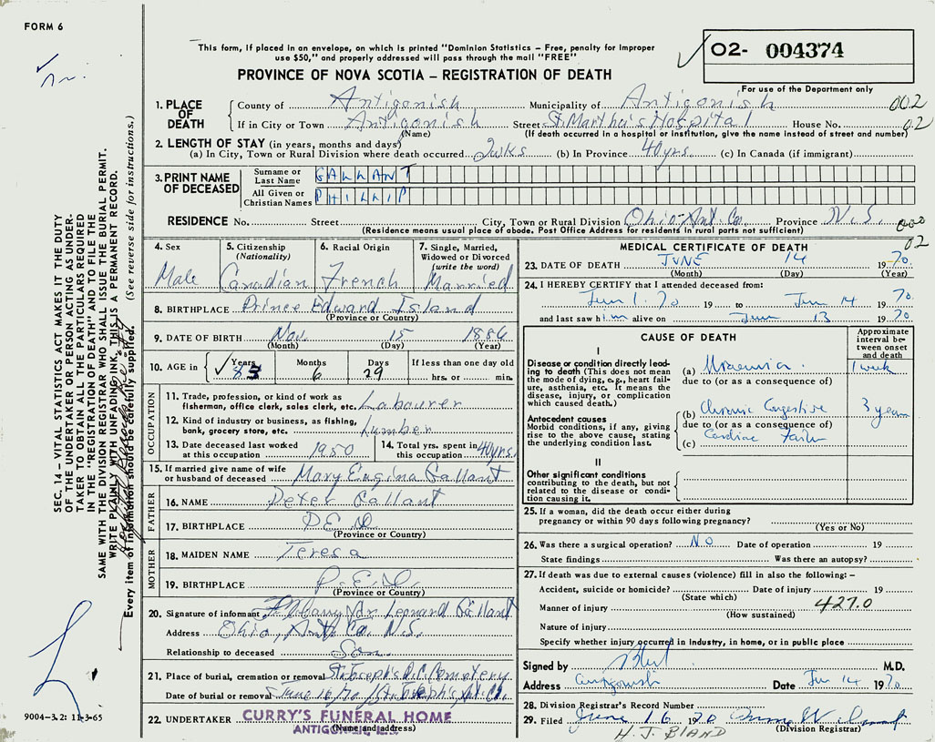 1. PLACE OF DEATH County of Antigonish If in City or Town Antigonish