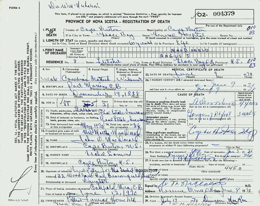 1. PLACE OF DEATH County of Cape Breton If in City or Town Glace Bay