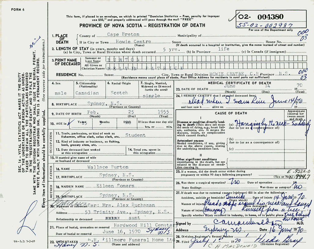 PROVINCE OF NOVA SCOTIA — REGISTRATION OF DEATH