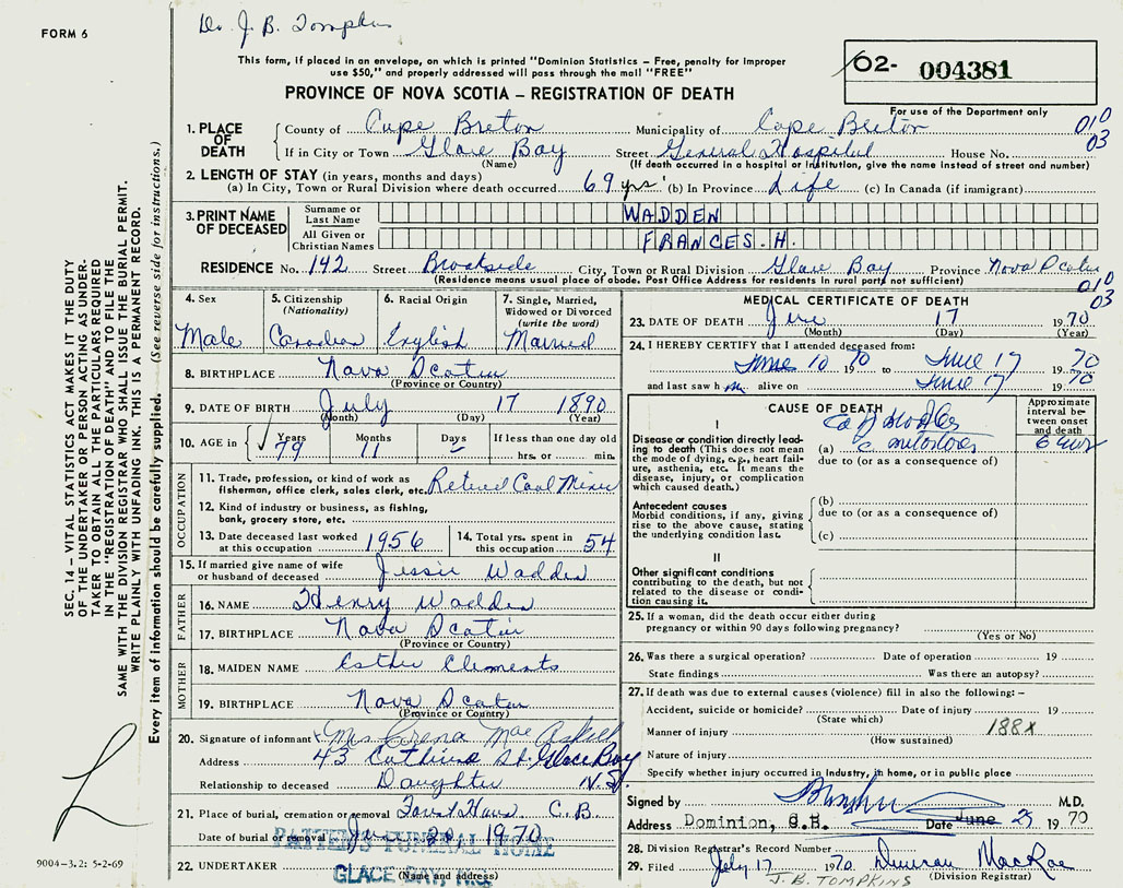 1. PLACE OF DEATH County of Cape Breton If in City or Town Glace Bay