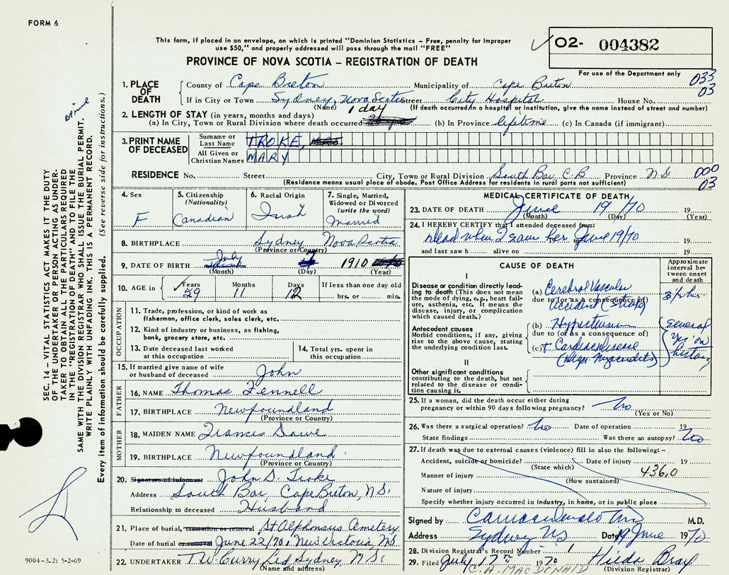 1. PLACE OF DEATH County of Cape Breton If in City or Town Sydney
