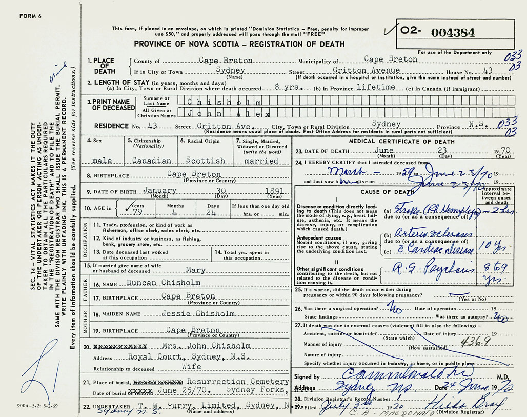 1. PLACE OF DEATH County of Cape Breton If in City or Town Sydney