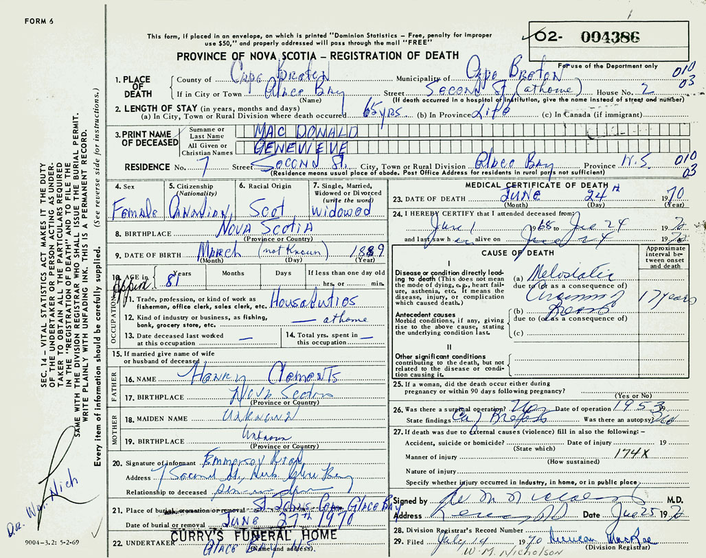 1. PLACE OF DEATH County of Cape Breton If in City or Town Glace Bay