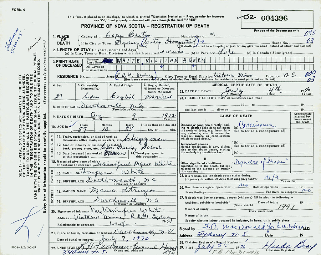 PROVINCE OF NOVA SCOTIA — REGISTRATION OF DEATH