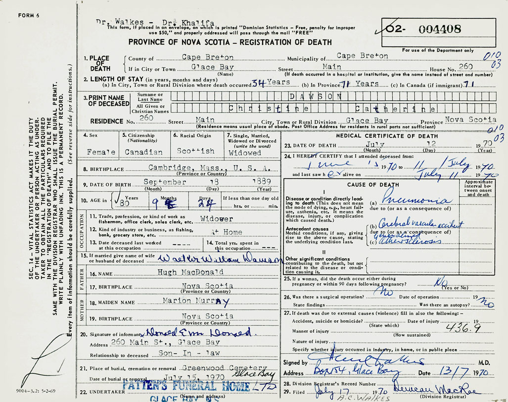 1. PLACE OF DEATH County of Cape Breton If in City or Town Glace Bay