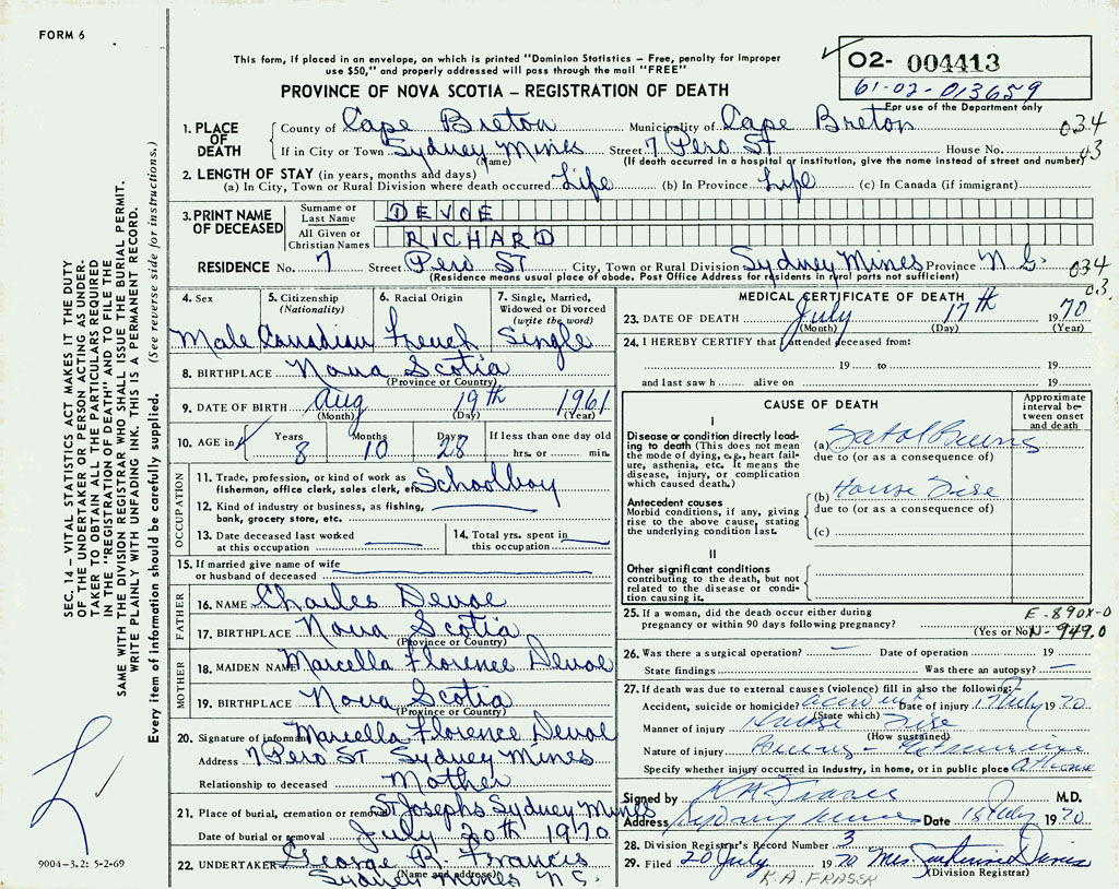 1. PLACE OF DEATH County of Cape Breton If in City or Town Sydney Mines