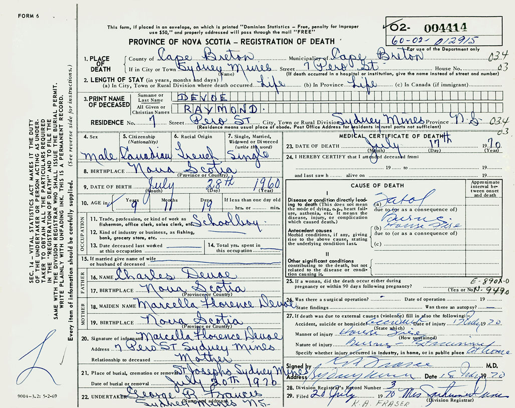1. PLACE OF DEATH County of Cape Breton If in City or Town Sydney Mines