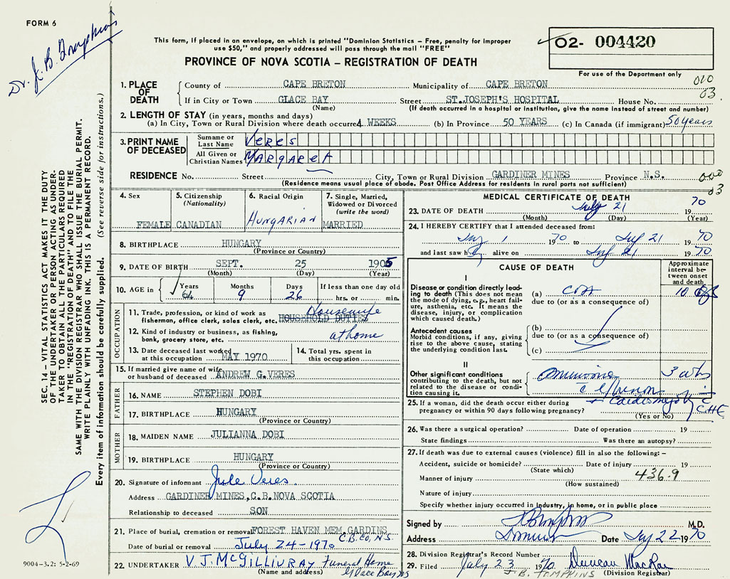 1. PLACE OF DEATH County of Cape Breton If in City or Town Glace Bay