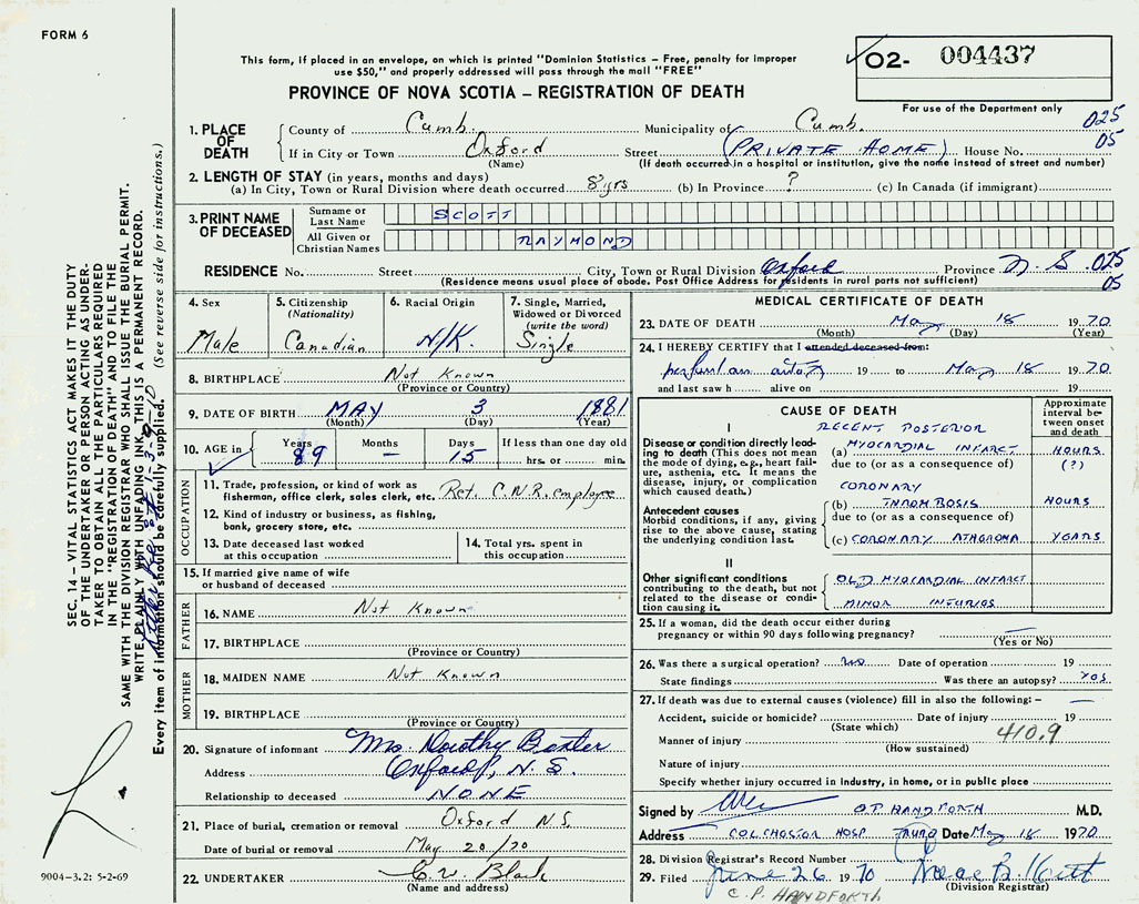 PROVINCE OF NOVA SCOTIA — REGISTRATION OF DEATH