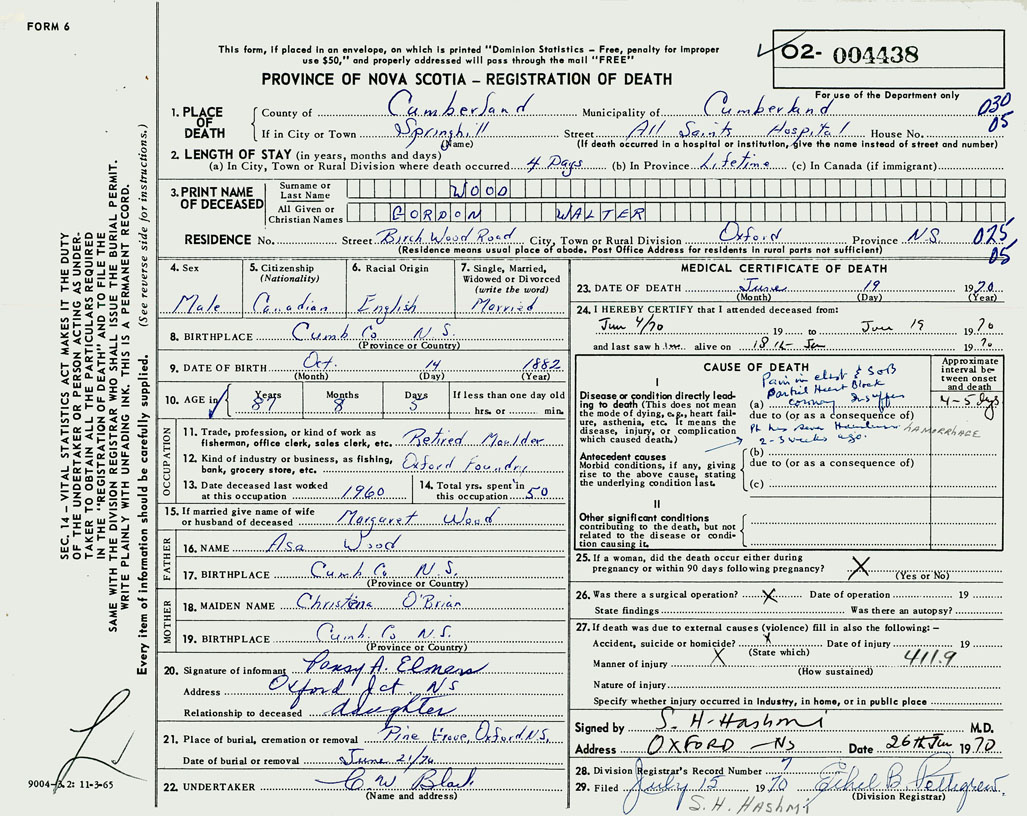 PROVINCE OF NOVA SCOTIA — REGISTRATION OF DEATH