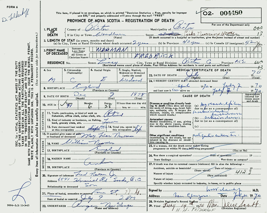 PROVINCE OF NOVA SCOTIA — REGISTRATION OF DEATH