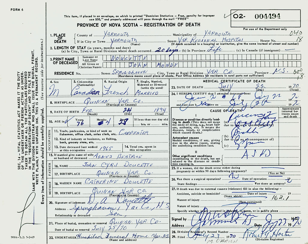 PROVINCE OF NOVA SCOTIA — REGISTRATION OF DEATH