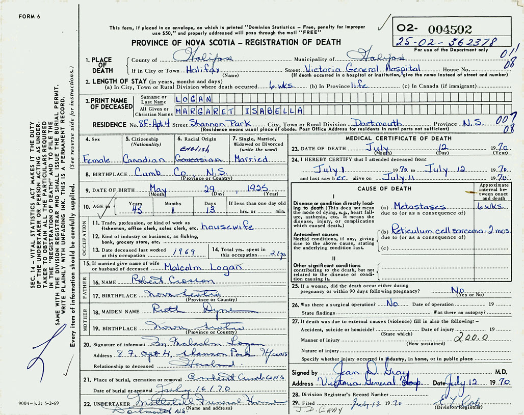 PROVINCE OF NOVA SCOTIA — REGISTRATION OF DEATH
