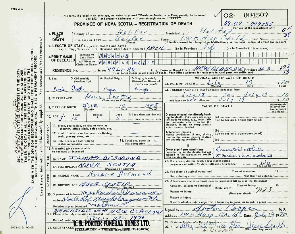 PROVINCE OF NOVA SCOTIA — REGISTRATION OF DEATH