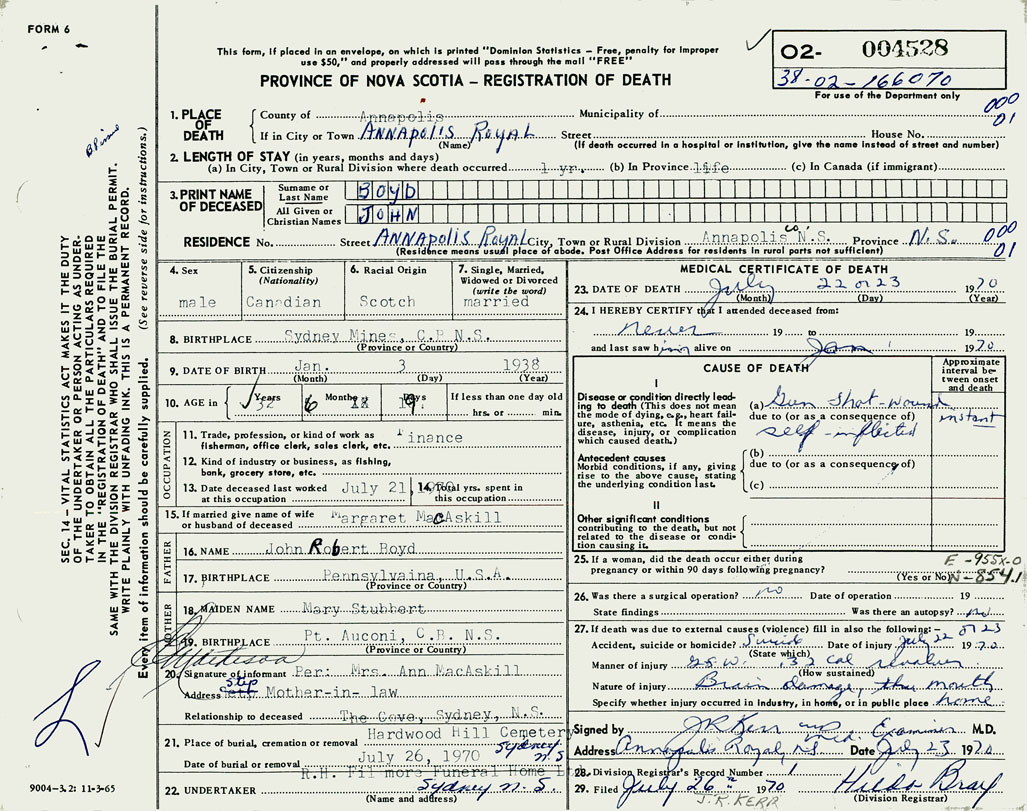 PROVINCE OF NOVA SCOTIA — REGISTRATION OF DEATH