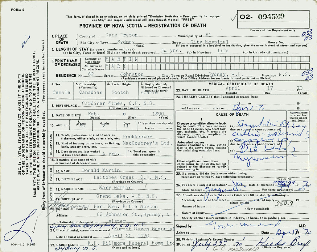 1. PLACE OF DEATH County of Cape Breton If in City or Town Sydney