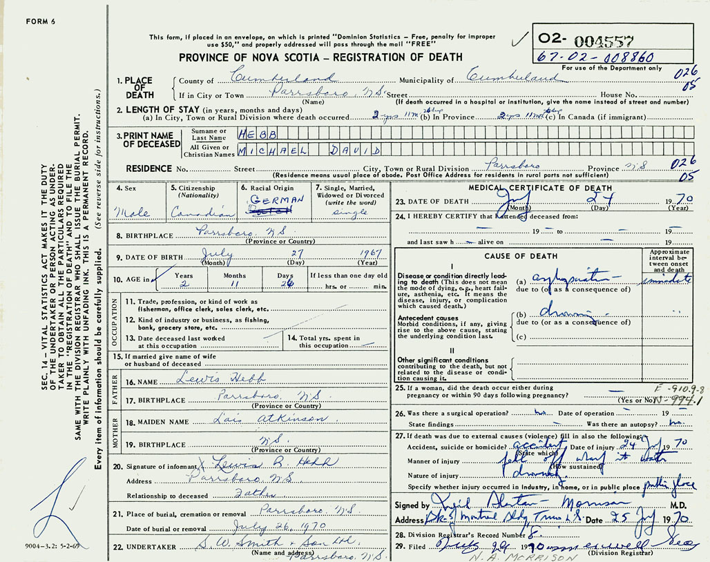 PROVINCE OF NOVA SCOTIA — REGISTRATION OF DEATH