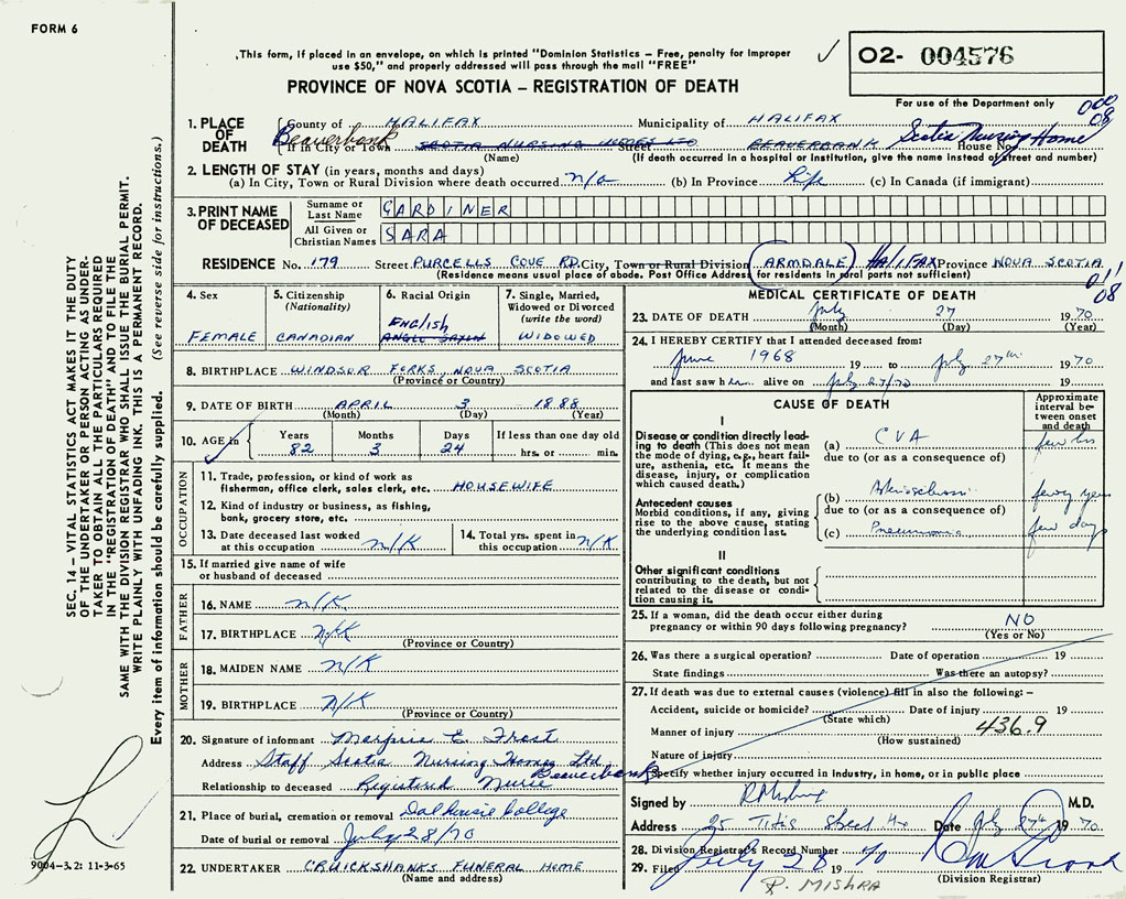 PROVINCE OF NOVA SCOTIA — REGISTRATION OF DEATH