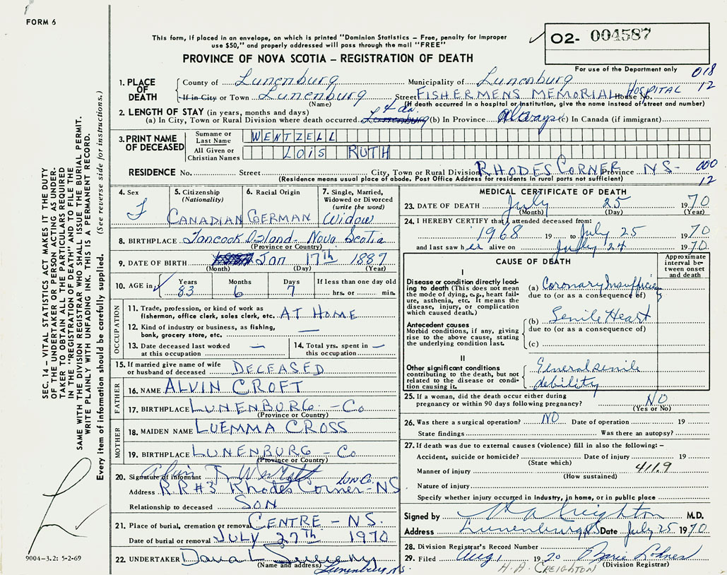 PROVINCE OF NOVA SCOTIA — REGISTRATION OF DEATH