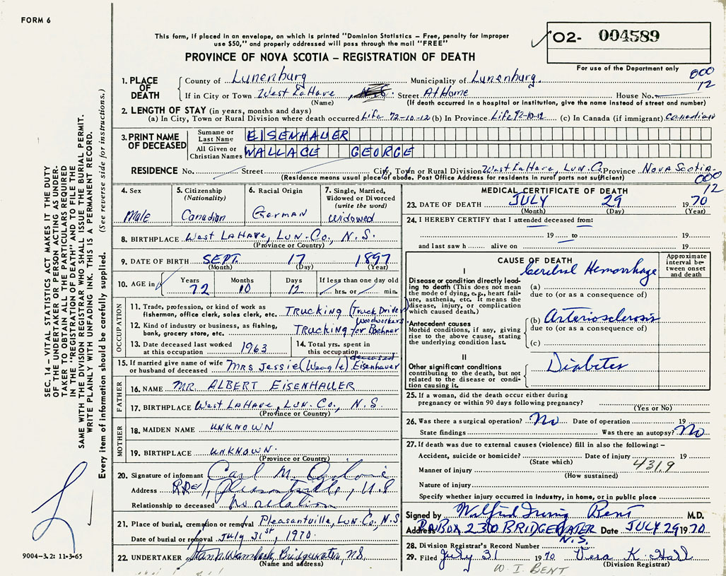 1. PLACE OF DEATH County of Lunenburg If in City or Town West Lahave