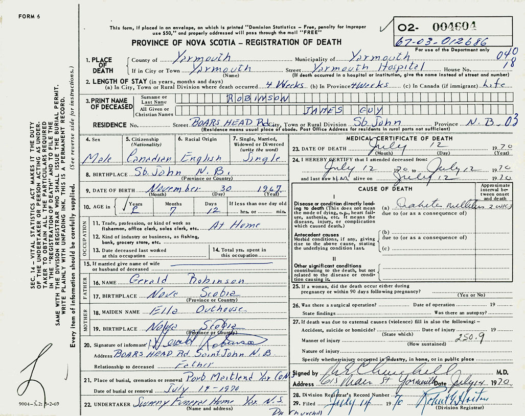 PROVINCE OF NOVA SCOTIA — REGISTRATION OF DEATH