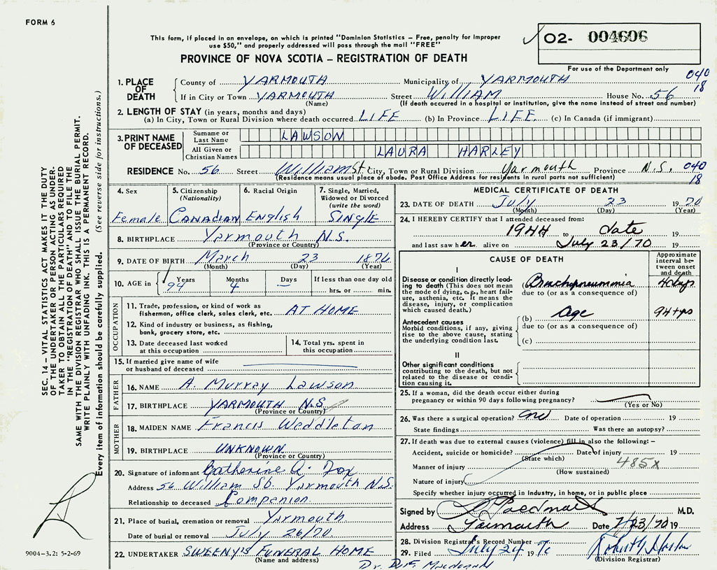 PROVINCE OF NOVA SCOTIA — REGISTRATION OF DEATH