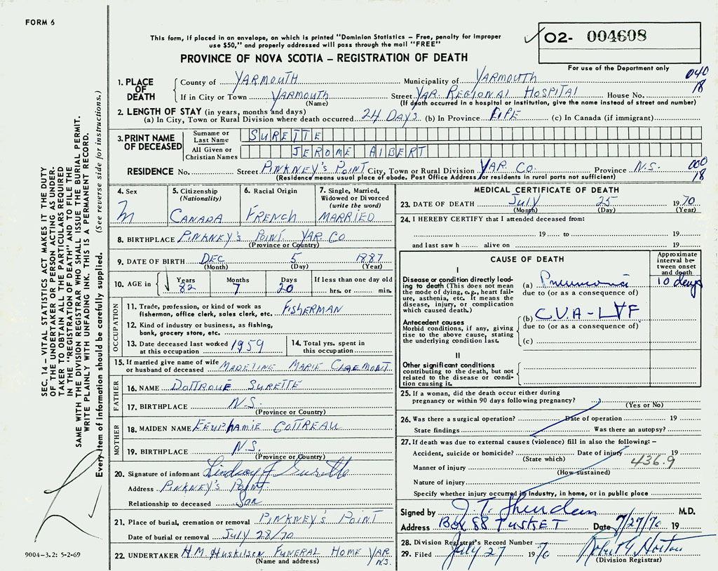 PROVINCE OF NOVA SCOTIA — REGISTRATION OF DEATH