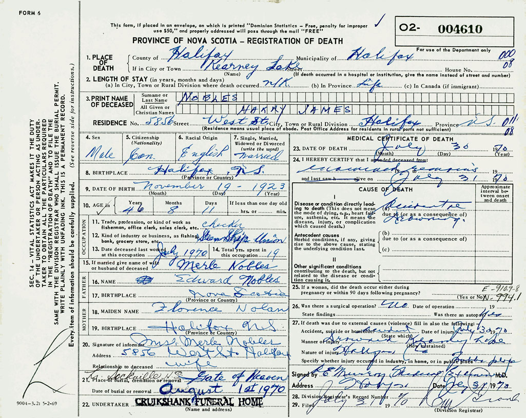 PROVINCE OF NOVA SCOTIA — REGISTRATION OF DEATH