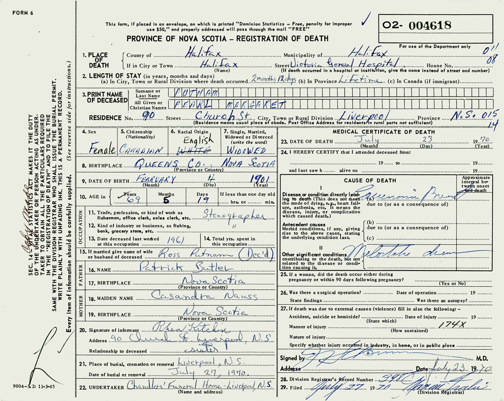 PROVINCE OF NOVA SCOTIA — REGISTRATION OF DEATH