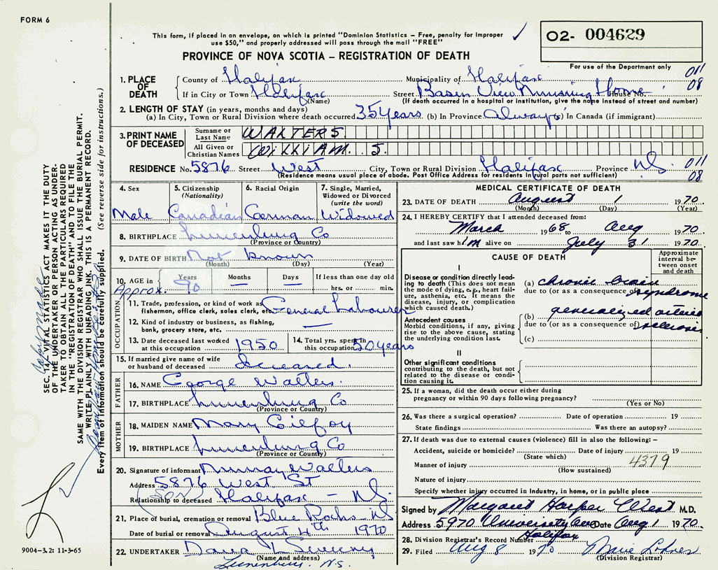 PROVINCE OF NOVA SCOTIA — REGISTRATION OF DEATH